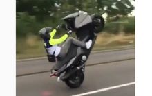 Atraksi wheelie atau mengangkat roda depan motor sambil mengendarainya memang terlihat hebat apalagi pakai matik bongsor seperti biker ini