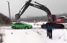 Mobil sedan melawan escavator, mendengarnya saja sudah aneh. Soal kecepatan pastinya menang sedan tapi kalau kekuatan