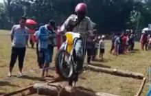 Balapan motor trail ini awalnya biasa saja, tapi saat melewati halang rintang yang ada malah terjadi hal tak terduga