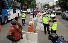 Polisi mulai merapikan pembatas jalan di Simpang Duren Tiga yang dibongkar paksa warga. Namun tindakan ini
