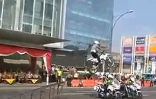 Atraksi jumping degan motor yang dilakukan anggota polisi lalu lintas mendarat kurang sempurna, sampai terjungkal, malunya itu lho