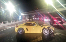 Kecelakaan hebat melibatkan Porsche warna kuning dengann sebuah city car Nissan bewarna putih di Tol Tomang arah Pluit