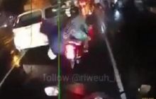 Bukti bahaya jas hujan ponco terekam jelas dalam sebuah video. Wanita yang sedang membonceng motor harus terjungkal karena jas hujan terlilit rantai