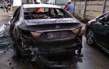 Mobil Hyundai Sonata berpelat nomor B 1598 SEA terbakar di Jalan Gas Alam arah Pintu Tol Cijago Kelurahan Cisalak Pasar, Kecamatan Cimanggis, Depok