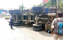 Truk kontainer bermuatan keramik bernomor polisi B 9349 TEI terguling di depan Gerbang Tol Bekasi Barat, pada Jumat (14/12/2018).