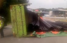 Besi Tumpah di Jalan Tol Sidoarjo, Truk Patah Dua Rebah Tutup Jalan