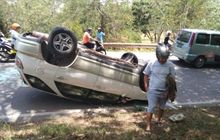 Terjadi Kecelakaan yaitu sebuah mobil Toyota Harrier Putih dengan nomor polisi BP 267 ZJ terguling hingga ringsek.