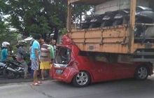 Rusak Parah, Honda Brio Masuk Di Kolong Truk Pengangkut Motor