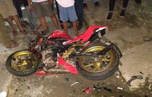 Sebuah sepeda motor yang ditumpangi empat remaja menabrak truk tronton, di Jalan Raya Cianjur Sukabumi, Kampung Cipadang, Desa Bangbayang