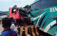 Sebuah trul trailer yang diduga remnya blong, semapat menabrak barrier beton sebelum menyerempet bodi sebelah kanan bagian bus Handoyo.