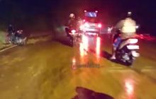 Empat pengendara motor tergelincir karena kondisi jalan yang licin karena tergenang air dan juga lonsoran tanah