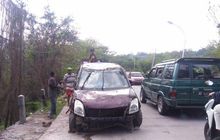 Sebuah teruk pengangkut pasir mengalmii rem blong meyerempet motor dan dua mobil baru berhenti setelah menabrak pohon hingga tumbang