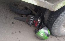 Sebuahkecelakaan terjadi, seorang driver ojek online jatuh saat melewati jalanan bergelombang, motornya rusak parah masuk kolong truk dan keseret