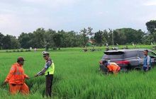 Toyota Fortuner mengalami kecelakaan tunggal, oleng dan menhantam pembatas jalan hingga mobil tersebut masuk ke parsawahan warga