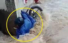 Tak disangka, banjir yang arusnya cukup kuat ini membuat seorang pengendara motor hanyut hingga meninggal dunia