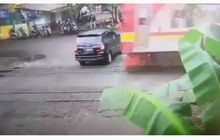 Sebuahmobi MPV mengalami kerusakan bagian belakangnya setelah terserempet kereta yang kedua saat menyeberang rel.