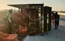 Ratusan ayam berserakan di jalan tol usai truk pengangktunya terguling. Diduga sopir mengantk hingga truk oleng saat ngebut.