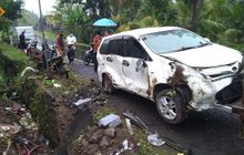 Sebuah Toyota Avanza alami ringsek di sisi kanan, semnatar sebuah motor alami rusak total usai ikut masuk selokan karena ditabrak mobil tadi.