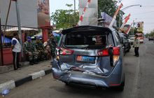 Truk tangki Pertamina terlibat kecelakaan beruntun dengan Kijang Innova dan satu mobil lain. Mobdin TNI rusak parah terutama di belakang.