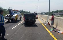 Terjadi kecelakaan tunggal, sebuah Toyota Avanza mengalami pecah ban menbrak mdian jalan dan berakhir terbalik di Jalan Tol