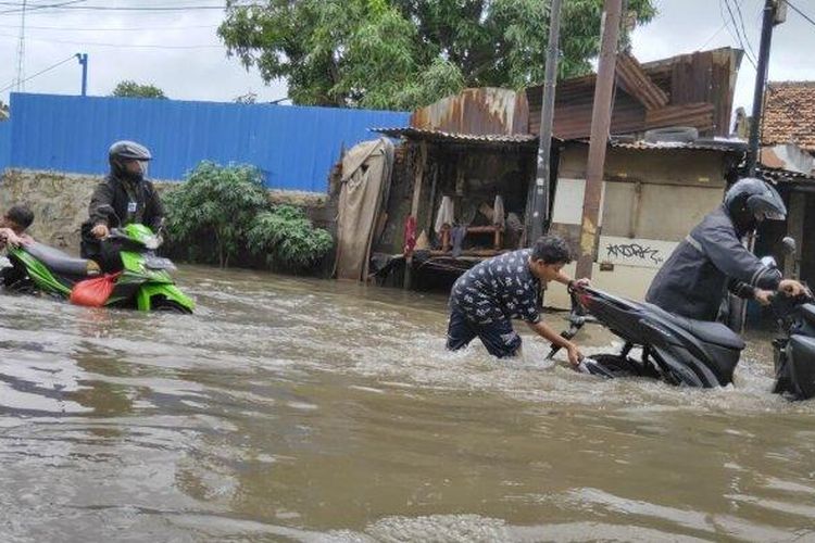 Kondisi jalanan banjir, anak-anak ini membantu para pengendra motor menerobos dengan car menutup lubang knalpot motornya dengan imbalan Rp 5000