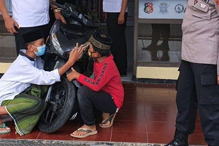 Dua santri peluk dan ciumi Honda Vario, tak bisa menahan haru, setelah sebelumnya hilang, ditemukan kembali oleh polisi.