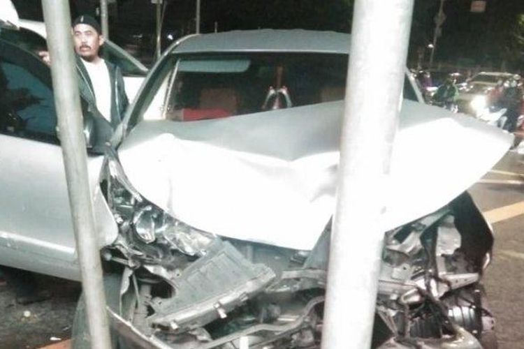 Muka Toyota Avanza rusak berat cium tiang, karena diduga menghindari sebuah ambulans terobos lampu merah.
