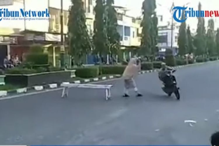 Viral Emak-emak bubarkan aksi balap liar, lempari kerumunan dan palangi jalanan pakai kursi panjang.
