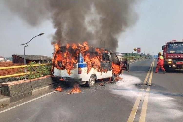 Sebuah mobil yang disinyalir merupakan angkutan karyawan pabrik, mengalami terbakar di flyover Cimindi, Kota Cimahi.