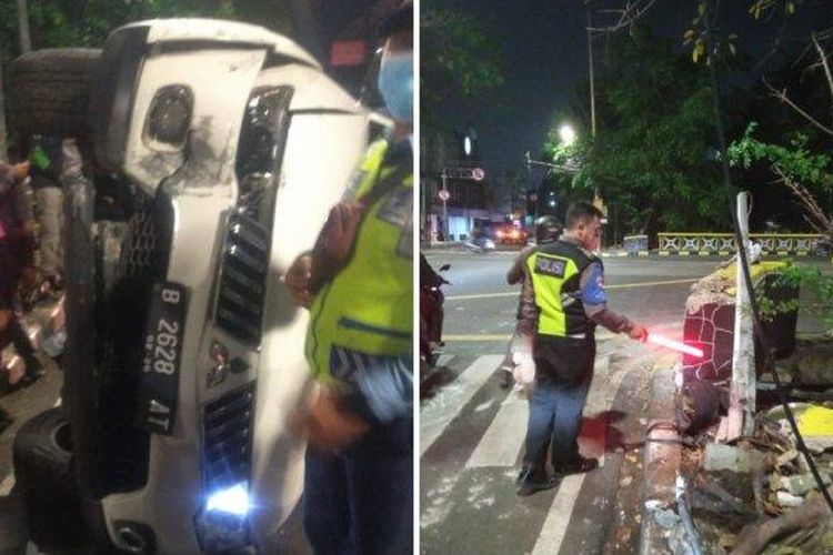 Hindari motor, Mitsubishi Pajero terbalik setelah menabrak tiang lampu, lalu lintas di Jalan Cideng Timur, Gambir, Jakarta Pusat.