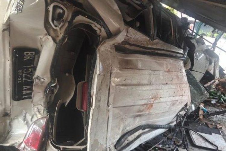 Sebuah mobil yakni Mitsubshi Pajero Sport rebah setelah menghantam warung kopi di Jalan Kolonel Bejo, Brayan.
