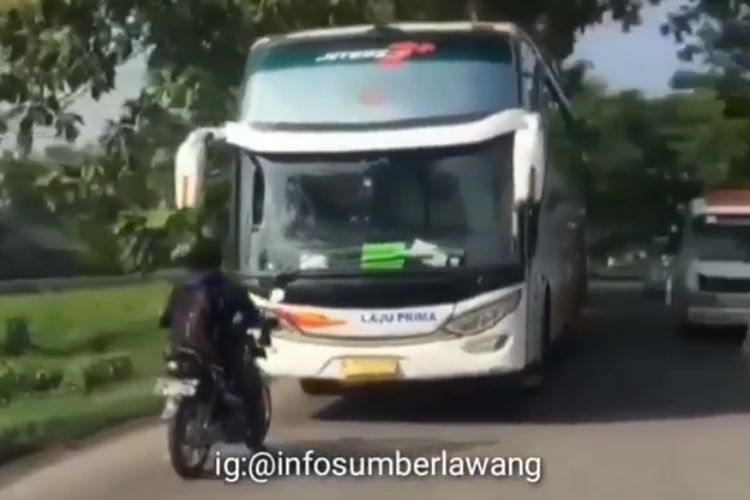 sebuah bus Lajur Prima kedapatan lawan arus di Sumberlawang, diahadang pengendara Honda Supra sampai berhenti, begini kejadiannya