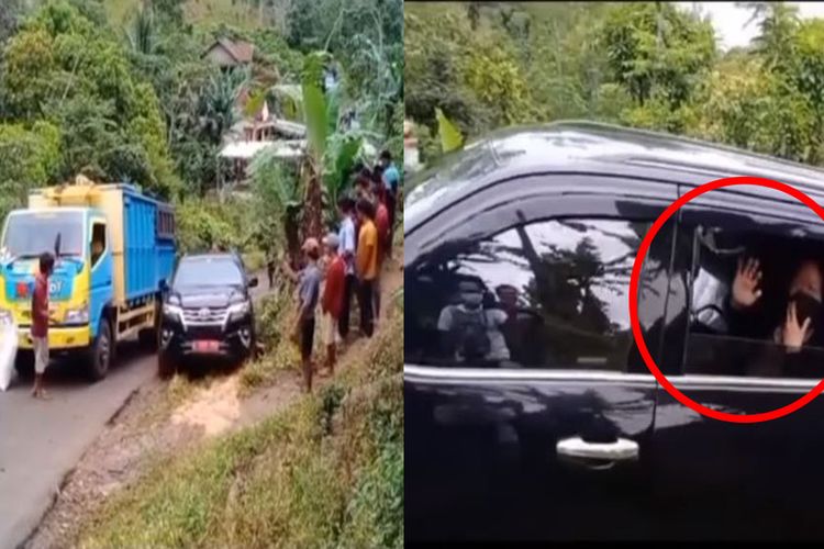Satu unit Toyota Fortuner pelat merah mendadak off-road, lewat bahu jalan berlumpur untuk menghindari truk mogok, sosok ini jadi sorotan