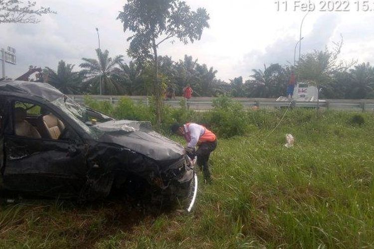 Terjadi kecelakan tunggal yang melibatkan Mitsubishi Pajero Sport menabrak pembatas hingga keluar dari jalan tol, begini kondisi korbannya
