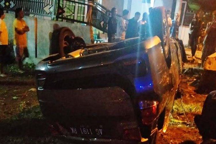 Honda Mobilio mengalami kecelakaan tunggal, menabrak tiang PJU dan rumah hingga terguling, satu penumpang meninggal dunia.