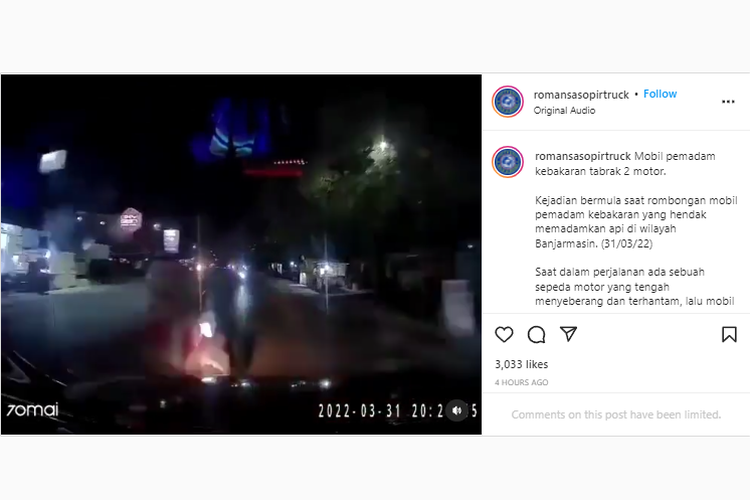Sebuah video memperlihatkan peristiwa kecelakaan terjadi pada mobil Damkar menabrak motor saat hendak menuju lokasi kebakaran