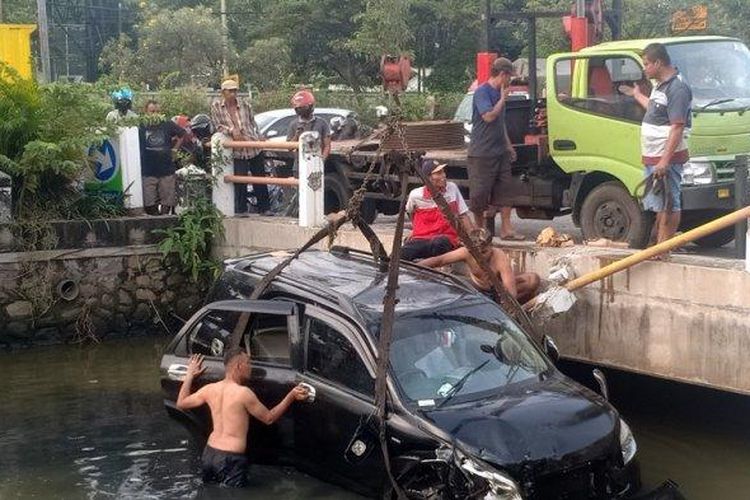 Sebuah mobil mengalami kecelakaan tunggal saat hendak mudik Lebaran, terjun ke sungai di Jalan Pantura Semarang-Demak