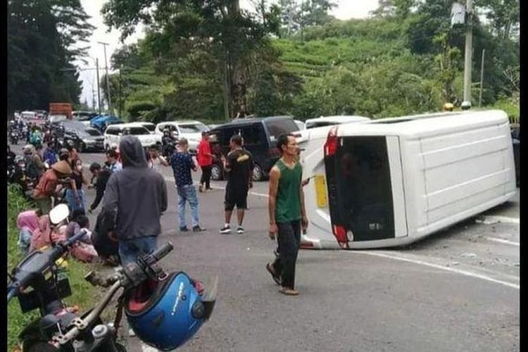 Satu unit Isuzu Elf travel mengalami kecelakaan tunggal di Tanjakan Emen Ciater, Subang, Jabar, Minggu (15/5/2022). Begini kronologinya.