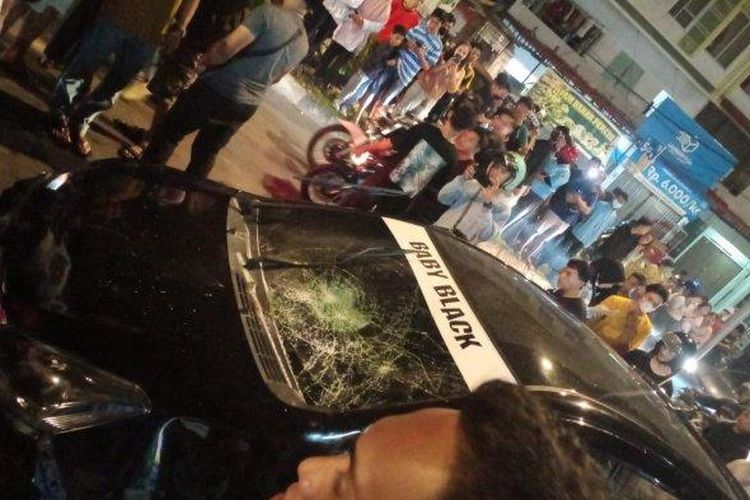 Satu unit Toyota Agya hancur dirusak massa yang mengamuk karena tingkah pengemudinya ugal-ugalan menabrak pengendara Scoopy.