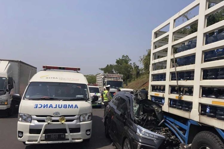 Terjadi kecelakan lalu lintas di jalan tol, sebuah mobil yakni Toyota Veloz menabrak bagian belakang sebuah truk.