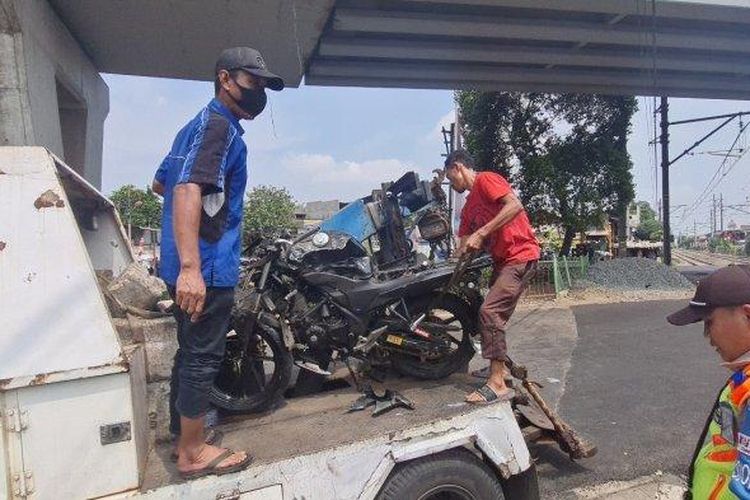 Seorang pengendara motor Honda meninggal dunia usai tertabrak kereta api di perlintasan KA Pesing, Jakarta Barat, Selasa (16/8/2022).
