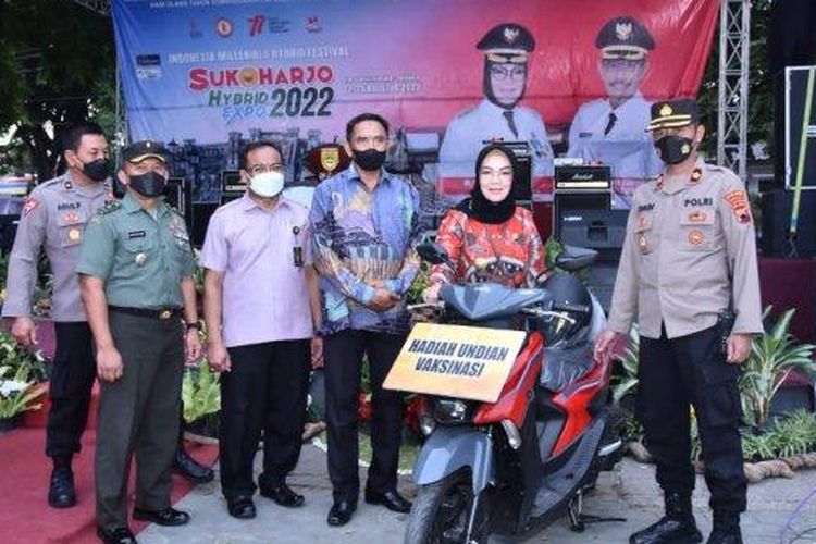 Seorang bapak beruntung mendapatkan satu unit motor berupa Yamaha Gear 125 setelah mengikuti vaksinasi Covid-19 dari Polres Sukoharjo.