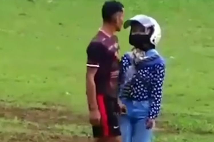 Kejadian unik, seorang wanita pakai helm masuk lapangan sepakbola menghampiri suaminya berusaha menggandeng ke luar lapangan.