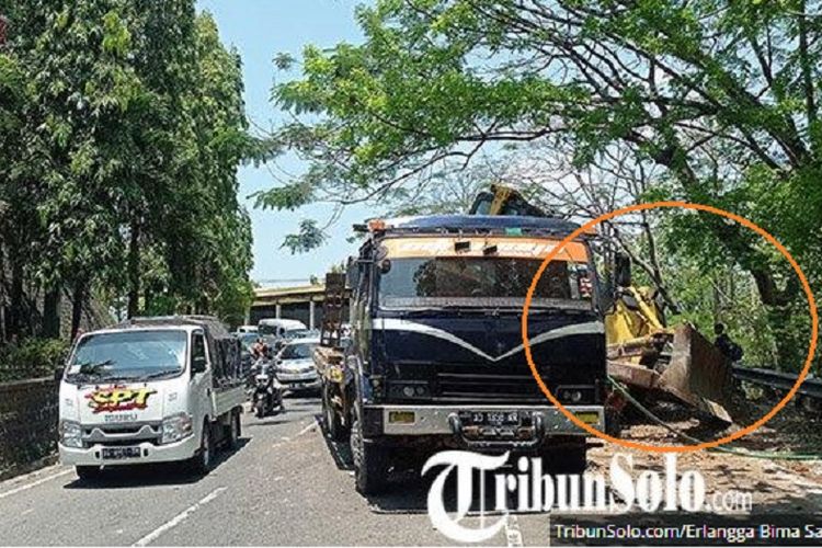 Sebuah alat berat berupa buldoser terjatuh dari truk yang mengangkutnya, terjadi di tikungan Jalan Raya Wonogiri-Solo, Selogiri.