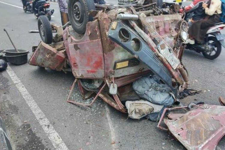 Terjadi kecelakaan lalu lintas melibatkan dua mobil yakni Toyota Rus dan Mitsubishi Colt hingga terbalik dan mengalami ringsek