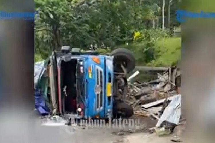 Sebuah truk tronton bemuatan vinyl mengalami kecelakaan lalu lintas, terguling dan menimpa dua warung.