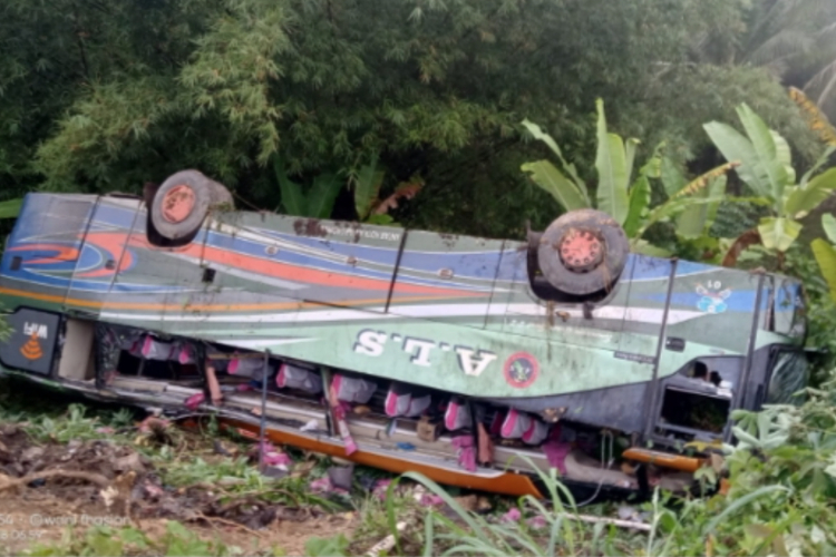 Sebuah Bus Antar Lintas Sumatera (ALS) yang berisi rombongan mengalami kecelakaan, terguling masuk ke dalam jurang.