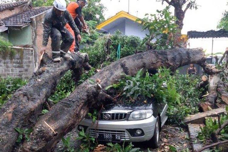 Sebuah unit mobil berupa Daihatsu Taruna bonyok tertimpa pohon mangga yang tumbang akibat terpaan angin.