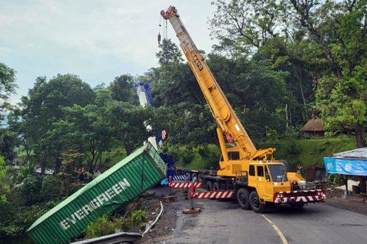 Proses pengangkatan kontainer atau peti kemas yang masuk ke jurang akibat tuk mengalami kecelakan berhasil dilakukan pada Kamis (15/12/2022).