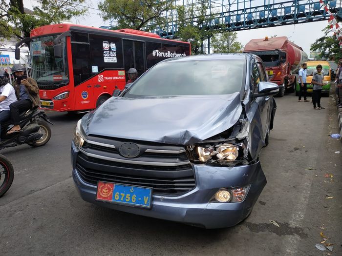 Otomania.com - sebuah kecelakaan beruntun yang melibatkan mobil dinas TNI AL dan sebuah truk tangki Pertamina terjadi di Semarang, Jumat (7/8/2020).